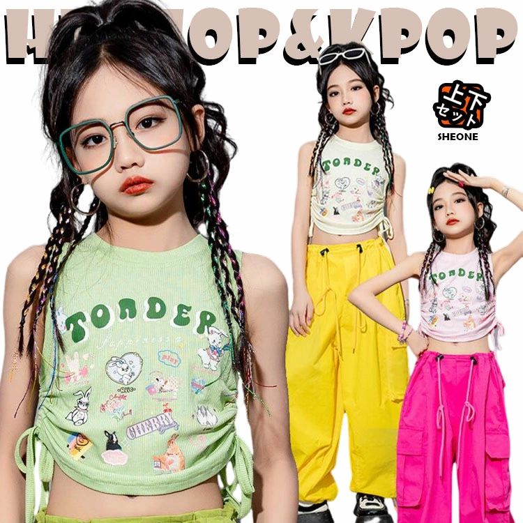 グリーン ブルー イエロー キッズ ダンス衣装 セットアップ トップス タンクトップ カーゴパンツ へそ出し キッズダンス トップス 女の子 男の子 ロング パンツ ジャズダンス ヒップ