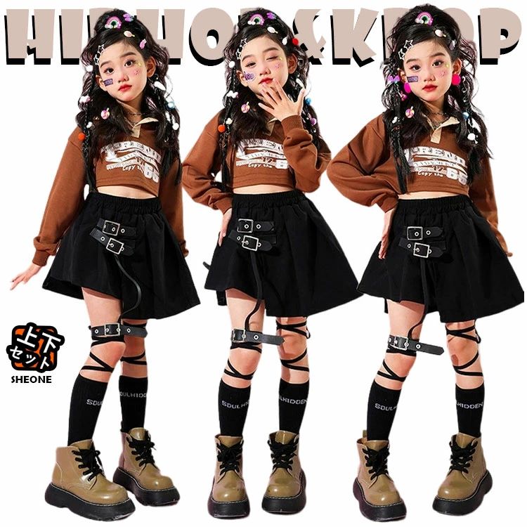 キッズ ダンス 衣装 セットアップ かわいい おしゃれ かっこいい 女の子 ガールズ ゆったり トップス スカート ブラック ブラウン ジャズダンス ヒップホップ 派手 韓国 kpop レッス
