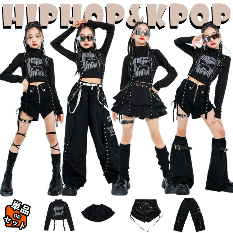 キッズ ダンス衣装 セットアップ 黒 カーゴパンツ スカート 半ズボン 長袖 トップス 女の子 チア チアガール 子供服 jazz 韓国k-pop ゆったり へそ出し 足カバー ワイドパンツ プリ