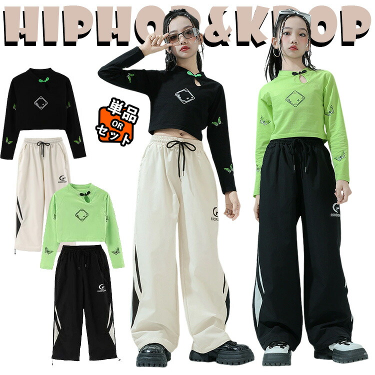 キッズ ダンス衣装 女の子 jazz チア チアガール 黒 緑 スポーツパンツ ショート丈 長袖 トップス へそ出し 韓国k-pop ショートトップ ゆったり 上下セット ジャズダンス セットアッ
