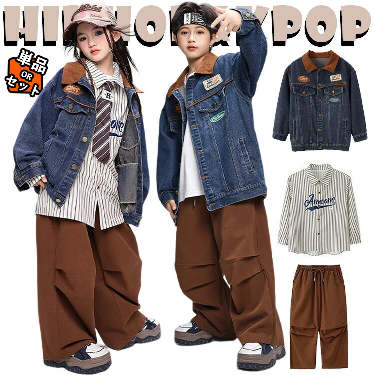 デニムジャケット キッズ ダンス衣装 女の子 男の子 ブラウン シャツ 長袖 トップス カーゴパンツ セットアップ カジュアル かっこいい ダンスウェア ヒップホップ ジャズダンス ポッ