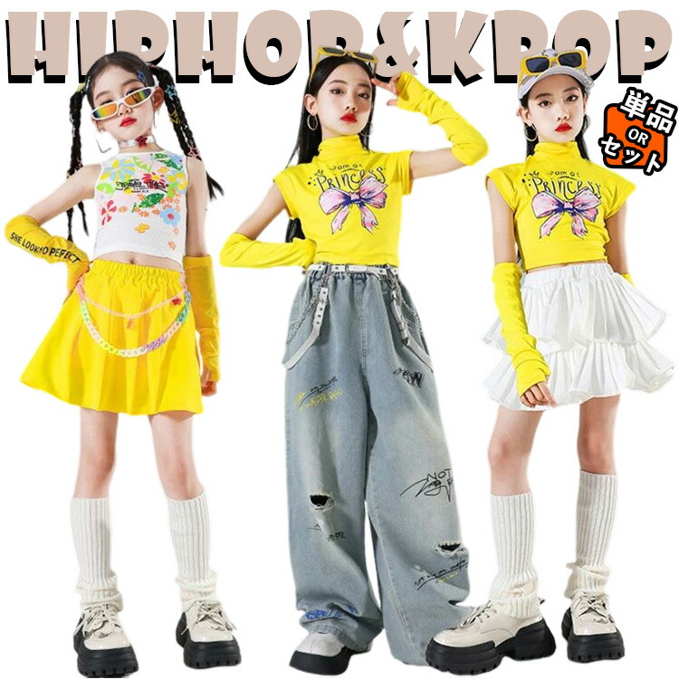 イエロー 白 チア チアガール 韓国- キッズ ダンス衣装 デニムパンツ スカート ショートトップ セットアップ 女の子 へそ出し トップス 総柄 プリーツスカート 子供服 演出