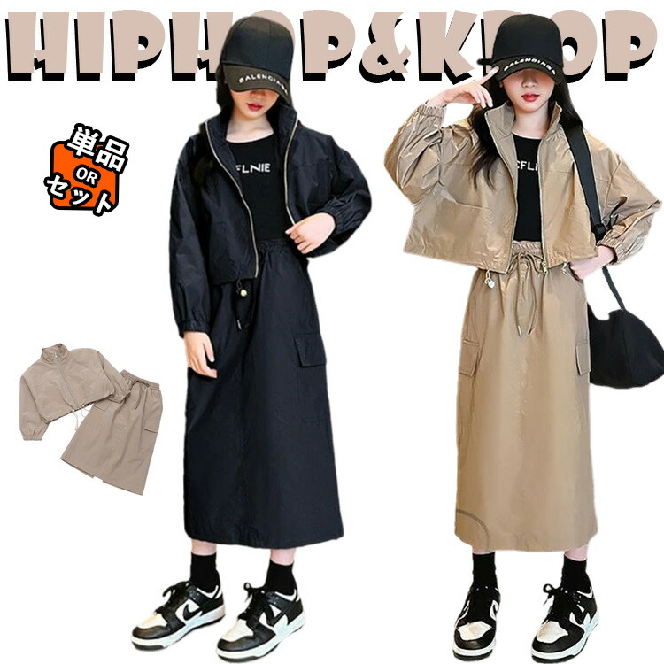 キーズ セットアップ カジュアル ジュニア ジャケット スカート 2点セット ロング丈 アウター ライトアウター 長袖 韓国 無地 シンプル ゆったり パーカー 中学生 女の子 上下セット