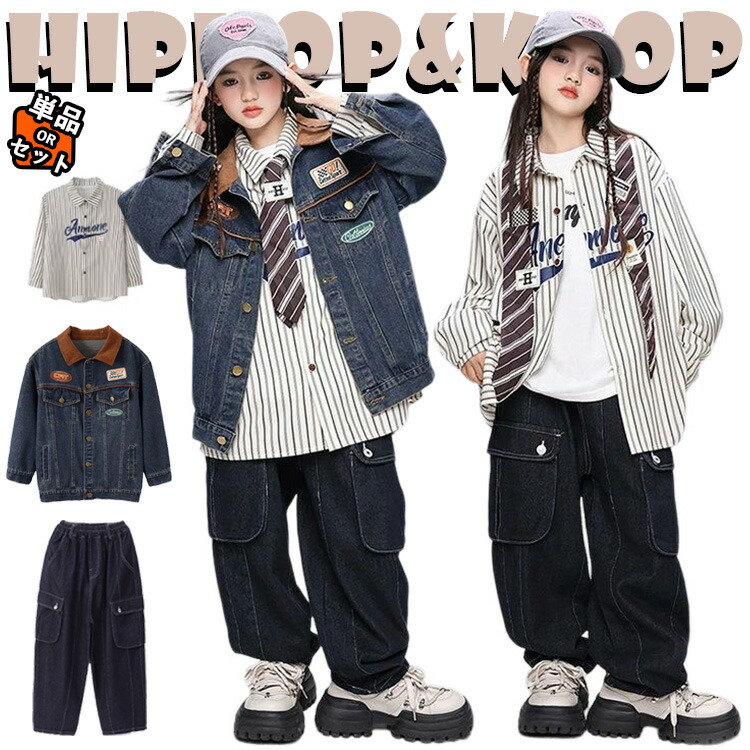 デニム 上下セット キッズ ダンス衣装 セットアップ 女の子 男の子 長袖 ジャケット スタジャン ユニセックス トップス カーゴパンツ サルエルパンツ ヒップホップ ジャケット 韓国