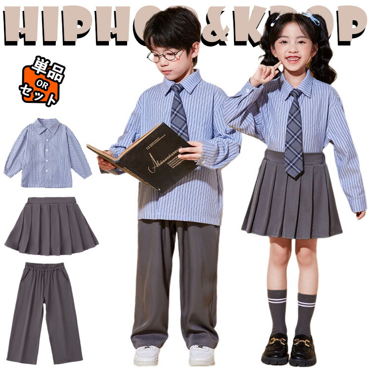 グレー ブルー ストライプ柄 子供服 フォーマルスーツ 小学生 入学式 卒業式 キッズ ダンス衣装 セットアップ シャツ プリーツスカート 長袖シャツ ワイドパンツ 女の子 男の子 韓国