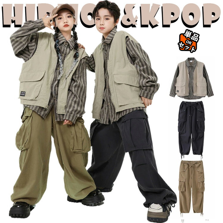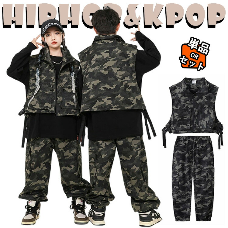 トップス ベスト ユニセックス衣装 キッズダンス衣装 セットアップ ストライプ柄 ジャケット 長袖 トップス 黒 迷彩 カーゴパンツ サルエルパンツ ジャズダンス ヒップホップ 韓国 K
