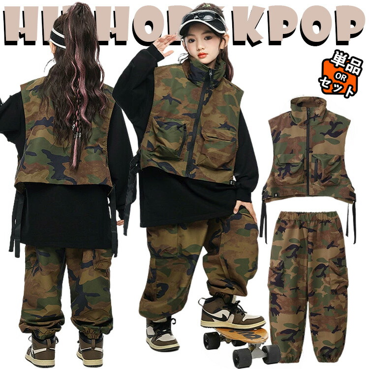 キッズ ダンス衣装 セットアップ ユニセックス衣装 カーキグリーン 迷彩柄 ベスト セット 長袖 ロングtシャツ ライナー トップス カーゴパンツ サルエルパンツ ヒップホップ ジャズダ