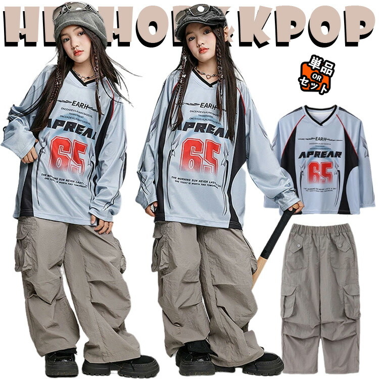 ユニセックス衣装 キッズ ダンス衣装 セットアップ 長袖 シャツ ロングシャツ ライナー 女の子 男の子 ゆったり ピッタリ かっこいい トップス グレー カーゴパンツ 韓国 - ジ