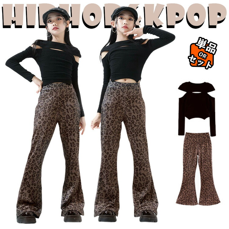 黒 トップス 総柄 豹柄 ベルボトムパンツ 韓国 jazz キッズ ダンス衣装 セットアップ 上下セット おしゃれ 女の子 かっこいい かわいい へそ出し ファション 長袖 ダンスウエア ヒッ