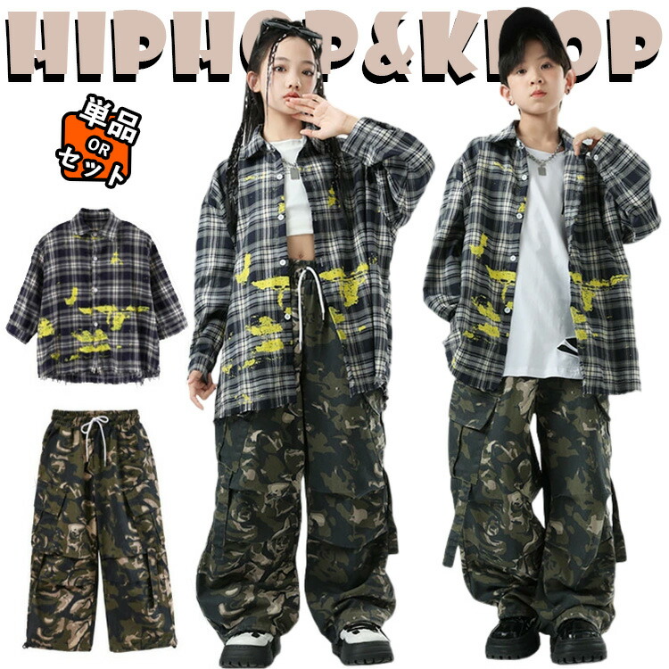 チェック柄 カジュアルシャツ 迷彩 カーゴパンツ キッズ ダンス衣装 セットアップ 上下セット おしゃれ 女の子 男の子 子供 かっこいい かわいい 長袖 タンクトップ ダンスウエア ヒ