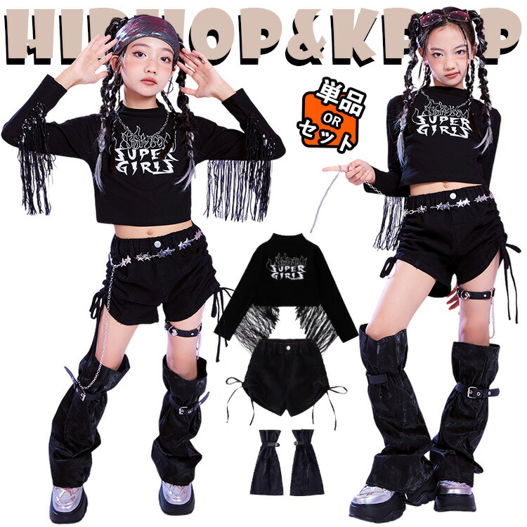 jazz 黒色 タッセル へそ出し キッズ ダンス衣装 セットアップ 女の子 子供 長袖 ゆったり カジュア トップス ショートパンツ 足カバー チア チアガール hiphop jazz ジャズダンス