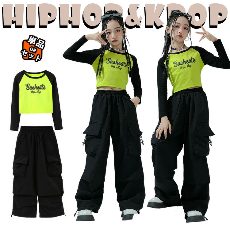長袖 緑 トップス 黒 カーゴパンツ 韓国 jazz キッズ ダンス衣装 セットアップ 上下セット おしゃれ 女の子 かっこいい かわいい へそ出し カジュアル へそ出し ダンスウエア ヒップ