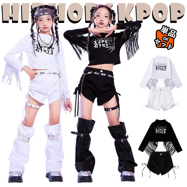jazz 黒色 白色 タッセル へそ出し キッズ ダンス衣装 セットアップ 女の子 子供 長袖 ゆったり カジュア トップス ショートパンツ 足カバー チア チアガール hiphop jazz ジャズ