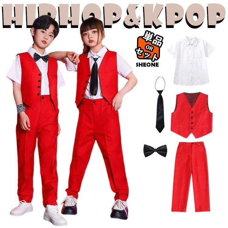 赤 黒 スーツセット セットアップ キッズダンス衣装 半袖 シャツ ベスト ネクタイ トップス パンツ ジャズダンス ヒップホップ 女の子 男の子 ストライプ 上品 発表会 演出服 ステー