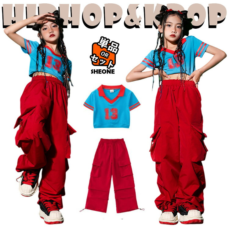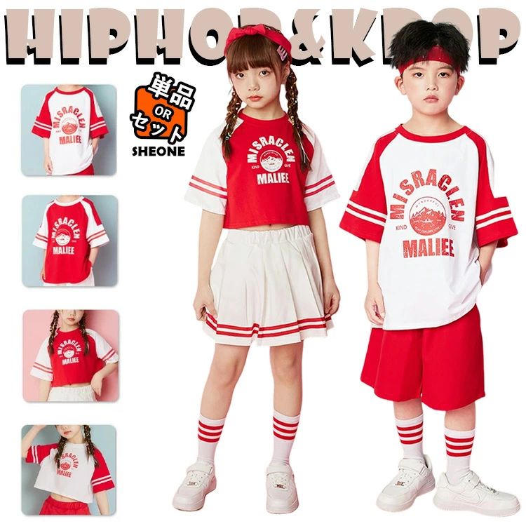 女の子 男の子 チア チアガール キッズ ダンス衣装 セットアップ レッド 白 へそ出し 半袖 トップス 応援団 発表会 パンツ 短パン スカート ミニスカート 韓国 k-pop ジャズダンス ヒ