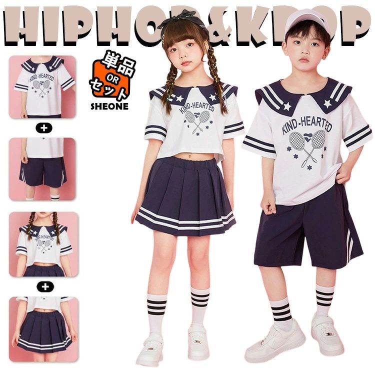 ネイビー へそ出し チア チアガール キッズ ダンス衣装 半袖 セットアップ 女の子 男の子 子供 トップス パンツ ショートパン スカート 韓国 - ジャズダンス ヒップホップ