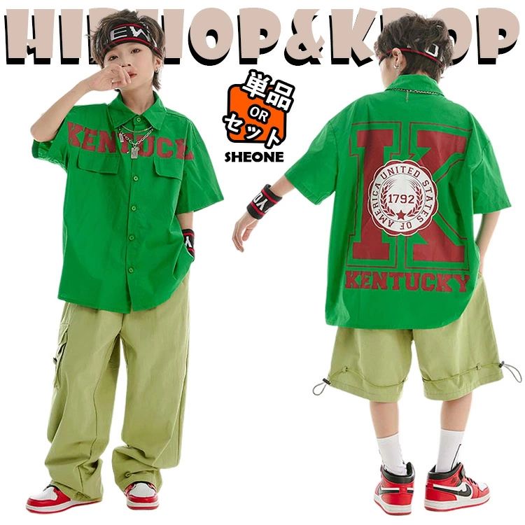 緑 オレンジ キッズ ダンス 衣装 ヒップホップ 韓国 ダンス衣装 セットアップ 発表会 レトロ サルエルパンツ 半袖 tシャツ トップス ショート ロングパンツ ゆったり ストリート