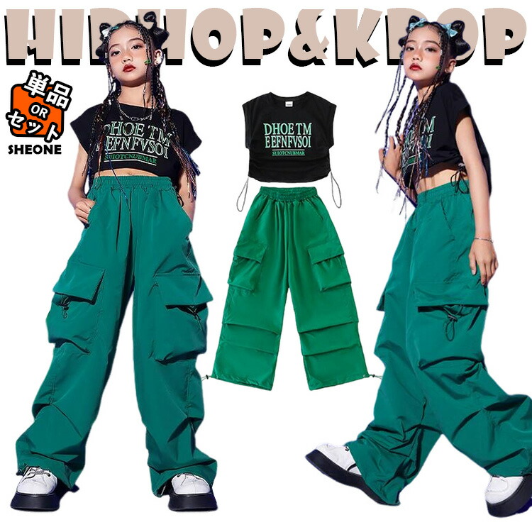 グリーン レッド カーゴパンツ キッズ ダンス衣装 セットアップ タンクトップトップス パンツ 女の子 ヒップホップ チア チアガール へそ出し カジュアルウェア ジャズダンス ストリ