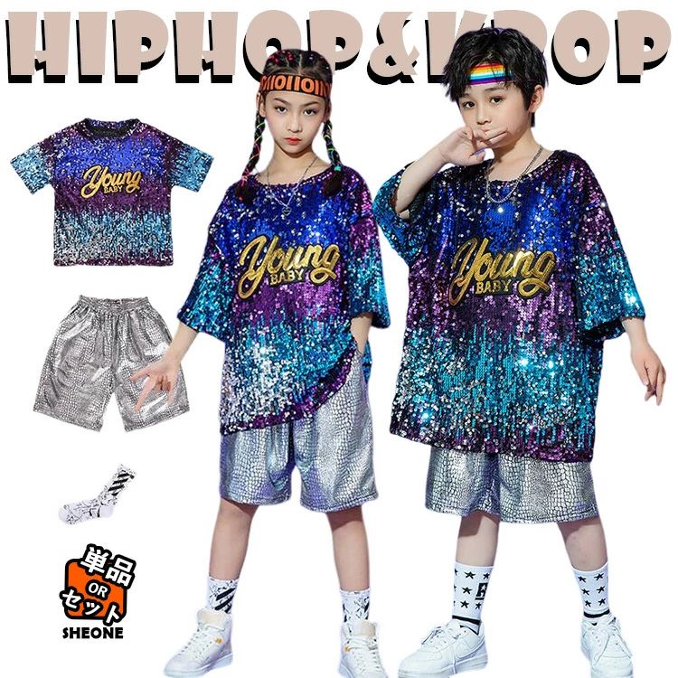 シルバー キッズ ダンス衣装 セットアップ 半袖シャツ 女の子 男の子 ゆったり おしゃれ カジュアルシャツ トップス パンツ 黒 短パン Tシャツ ヒップホップ ジャズダンス 韓国 k-pop