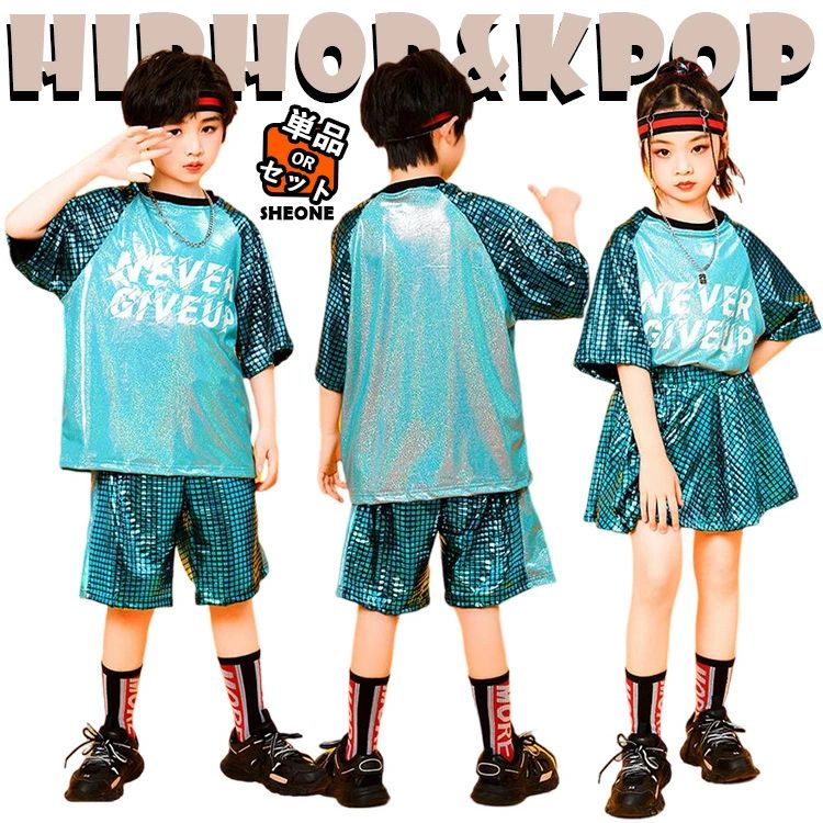 緑 半袖 キッズダンス衣装 セットアップ キラキラ トップス ハーフパンツ スカート 女の子 チアガール チア ラム奏者 ジャズダンス ヒップホップ 韓国k-pop hipop上品 発表会 ステー