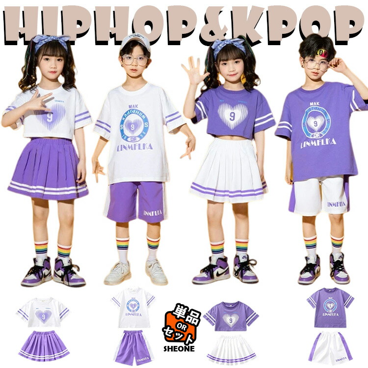 チア チアガール 女の子 男の子 韓国 キッズ ダンス衣装 セットアップ パープル ホワイト 柄シャツ 半袖 トップス 応援団 発表会 パープル短パン スカート 韓国 - ジャズダンス