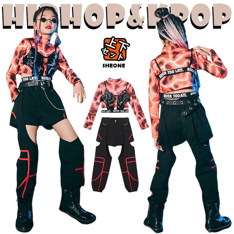 ブラック チア チアガール へそ出し 韓国 キッズ ダンス衣装 セットアップ 柄シャツ ショートトップス ハーフパンツ スカート 女の子 男の子 カジュアル ジャズダンス ヒップホップ
