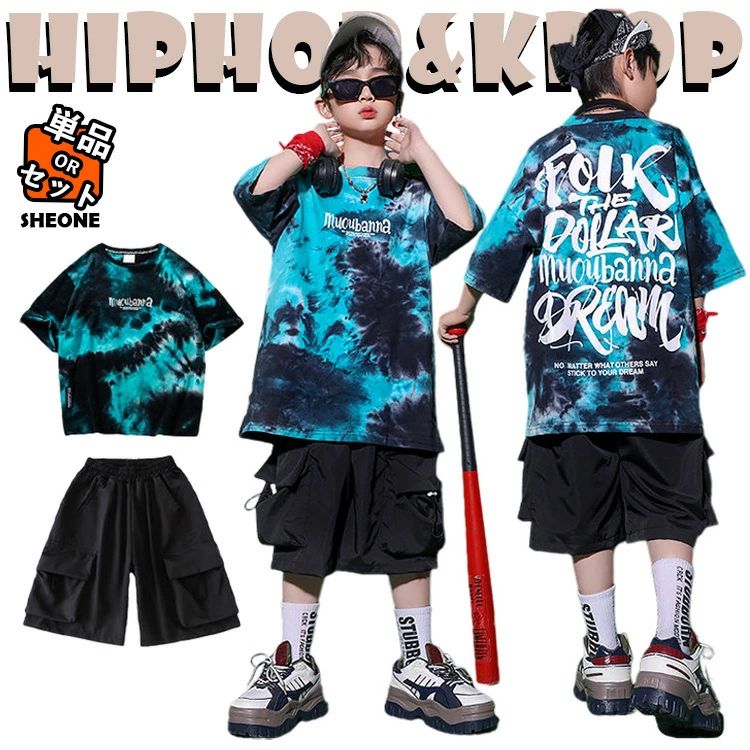 ブルー タイダイ柄 キッズ ダンス衣装 セットアップ ワンポイント おしゃれ 半袖シャツ ゆったり カジュアルシャツ トップス 黒 ブラック ハーフパンツ 短パン 2点セット ヒップホッ