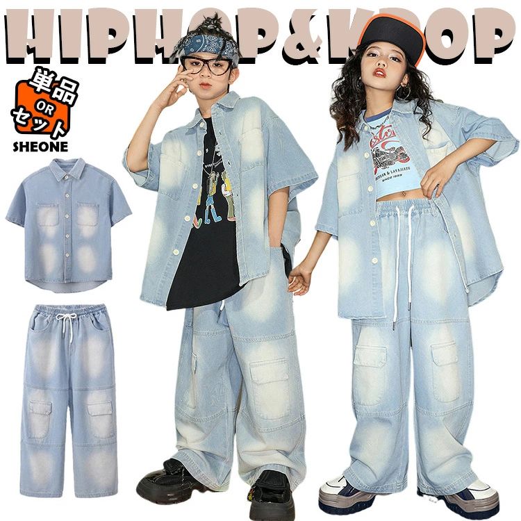 デニム 半袖シャツ キッズ ダンス衣装 セットアップ 女の子 男の子 子供 子ども カジュアルシャツ トップス パンツ シャツ ヒップホップ ジャズダンス 韓国 - 発表会 演