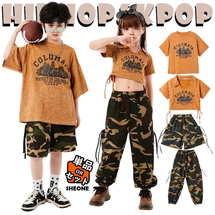 迷彩 キッズ ダンス衣装 セットアップ 半袖シャツ 女の子 男の子 ゆったり おしゃれ カジュアルシャツ トップス ロンパン シャツ タンクトップ ヒップホップ ジャズダンス 韓国 -