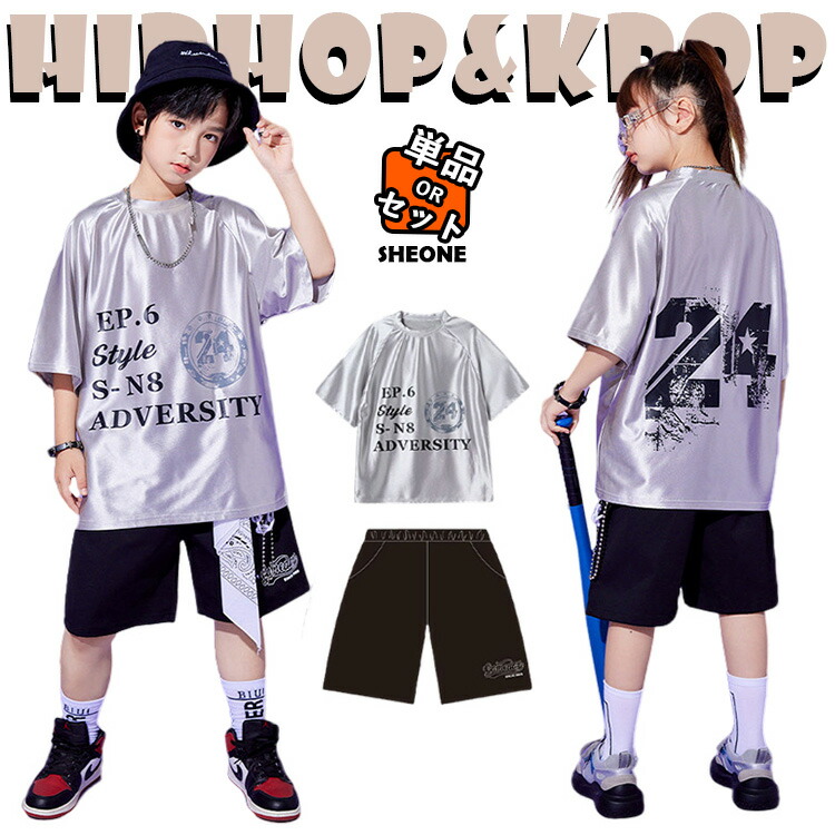 シルバー キッズ ダンス衣装 セットアップ 半袖シャツ 女の子 男の子 ゆったり おしゃれ カジュアルシャツ トップス パンツ 黒 短パン シャツ ヒップホップ ジャズダンス 韓国 -