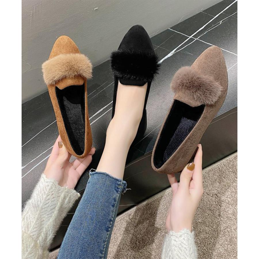 パンプス ファー付き ポインテッドトゥ 韓国風 フラットシューズ レディース 痛くない ぺたんこパンプス ローヒール 秋冬靴 脱げない 歩きやすい スエード調 春