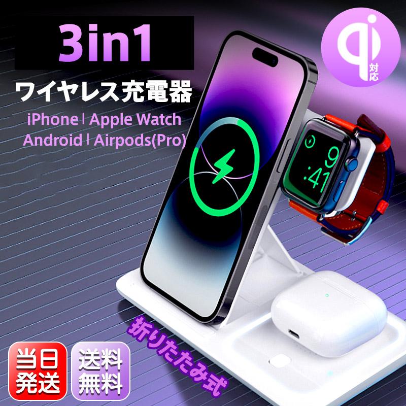 ワイヤレス充電器 iphone 3in1 ワイヤレス 充電器 最大15w 折り畳み式 iPhone Android アンドロイド ワイヤレスチャージャー 充電スタンド Qi充電