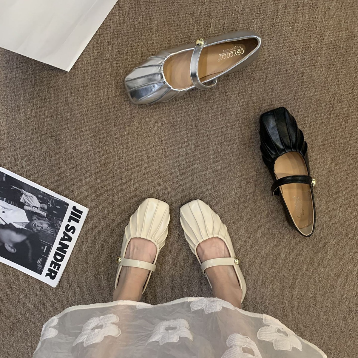 メリージェーンパンプス フラットヒール パンプス 甲ストラップ シルバーシューズ スクエアトゥ ストラップパンプス おしゃれ 可愛い 軽量 シルバー 黒