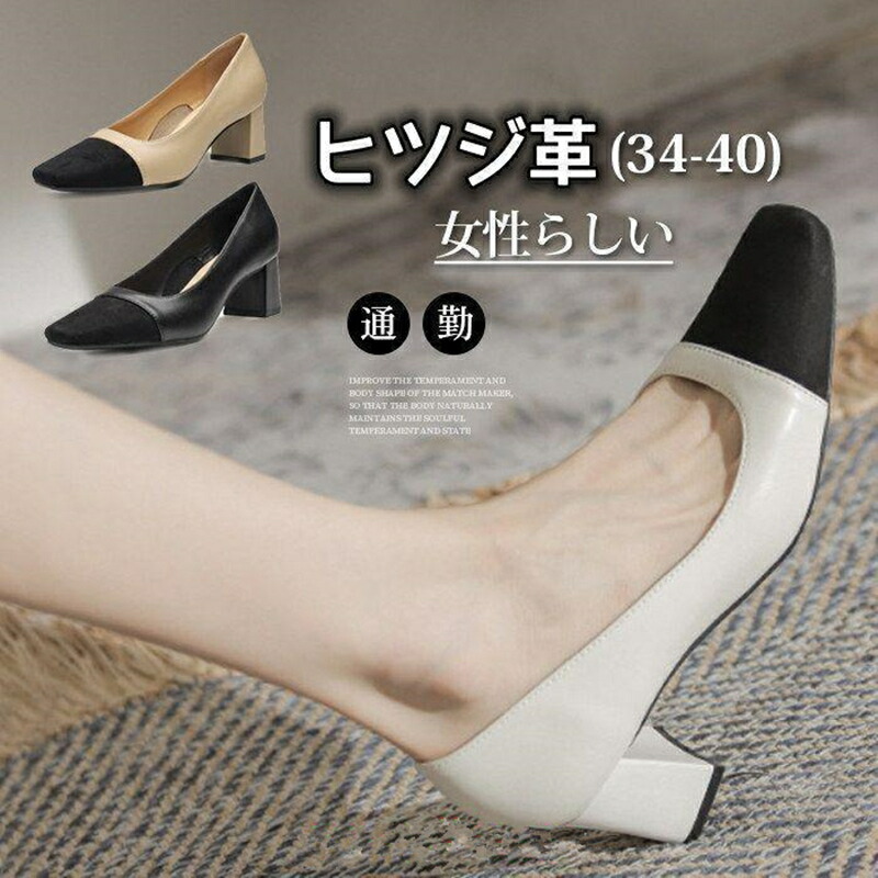 パンプス 本革 リクルート ローヒール ヒツジ革 痛くない 幅広 靴 シューズ 軽量 夏 春秋 通勤 結婚式 スクウェアトゥ バイカラー 面接 就職活動 就活 冠婚葬祭