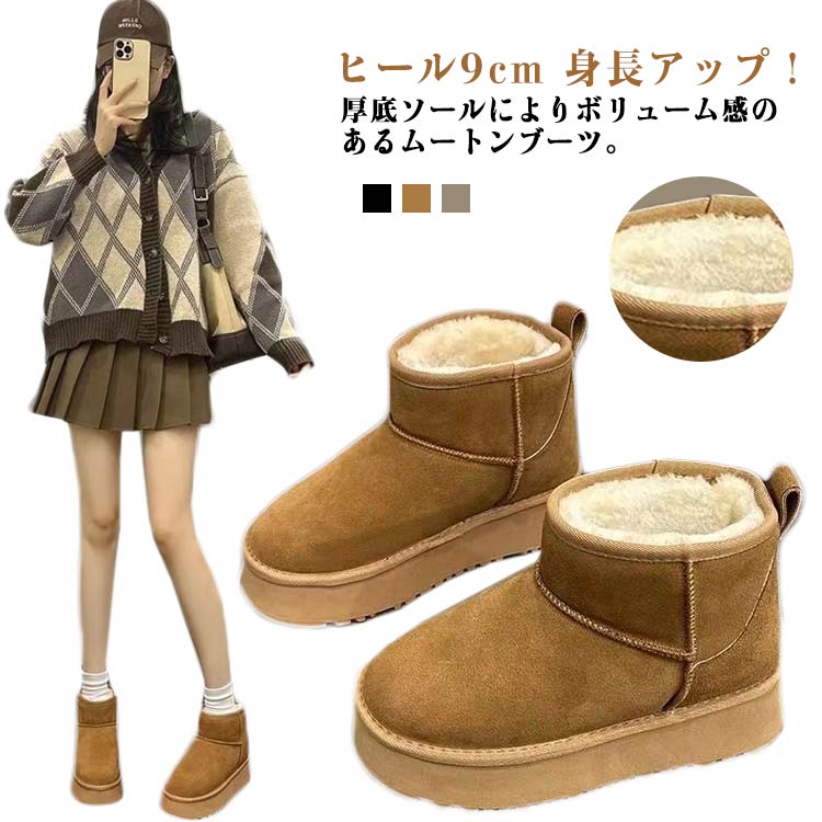 ヒール9 身長アップ ムートンブーツ スノーシューズ ブーツ スエード調 防寒 暖かい 裏ボア 裏起毛 ウインターブーツ レディース 厚底ブーツ ショートブーツ