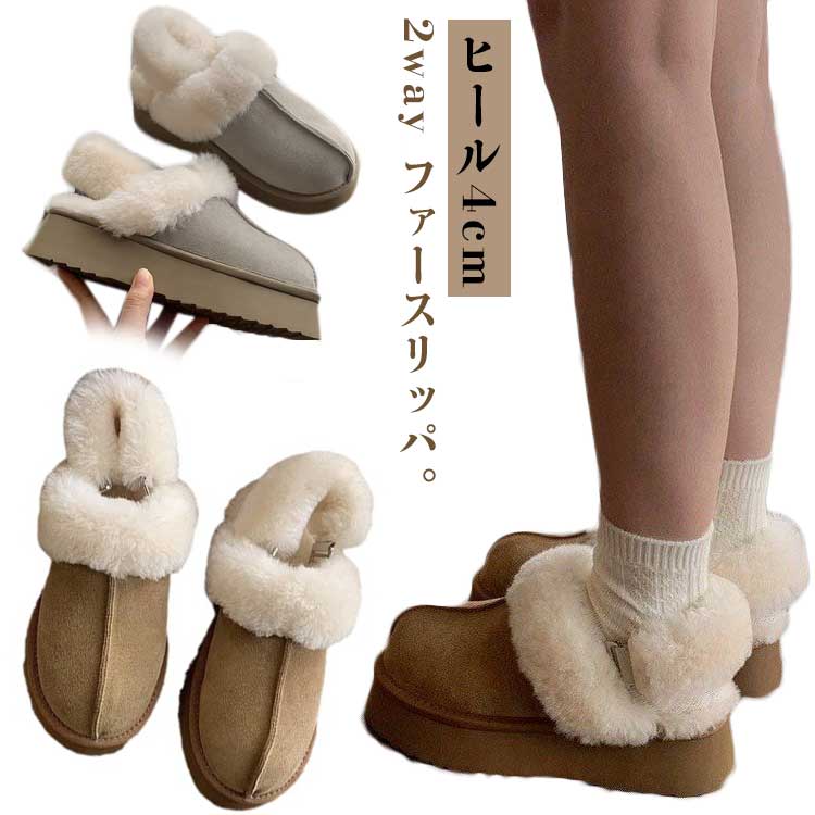 ムートンブーツ スノーシューズ レディース もこもこ スリッポン 厚底 スリッパ 2way 防寒 暖かい 裏ボア 裏起毛 厚底 ムートンスリッパ ファースリッパ ムートンルームシューズ