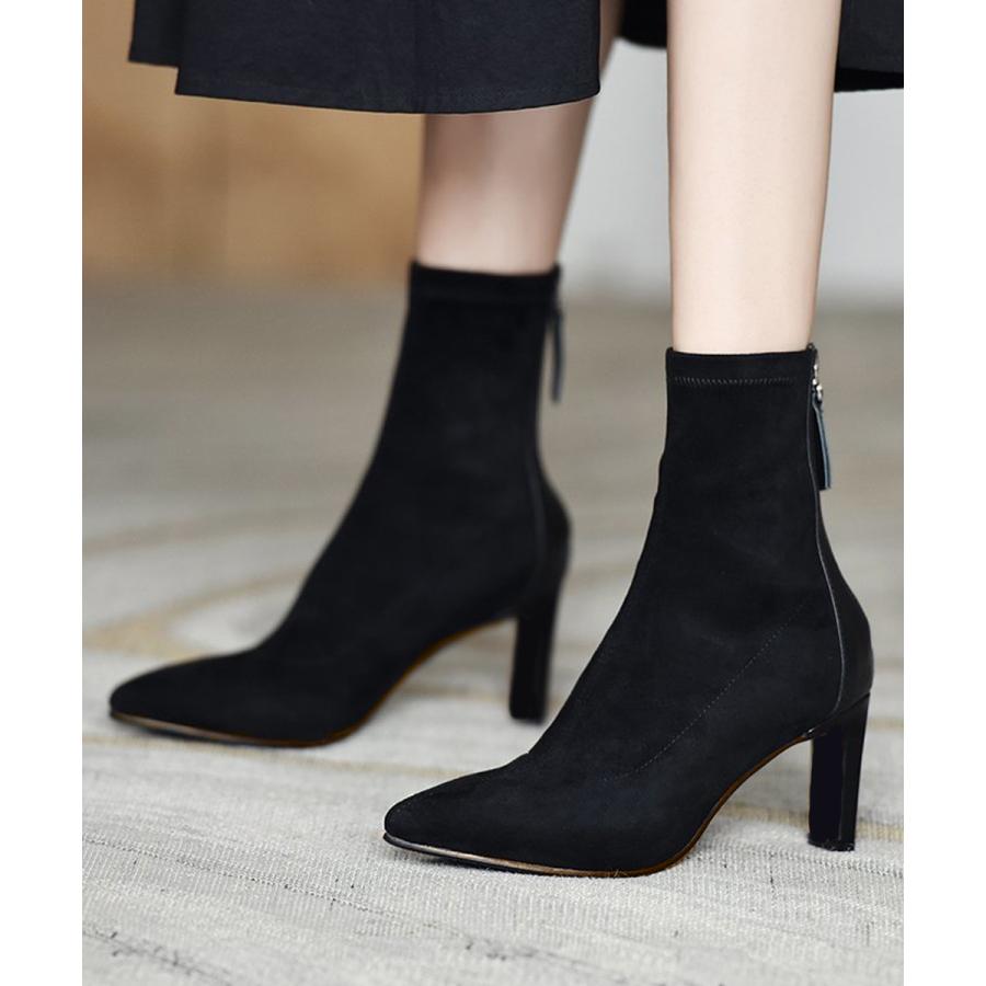 ショートブーツ レディース スエード 履きやすい 太ヒール 裏起毛 ブーティ ポインテッドトゥ ブーツ レディース 靴 ポインテッドトゥ グレー