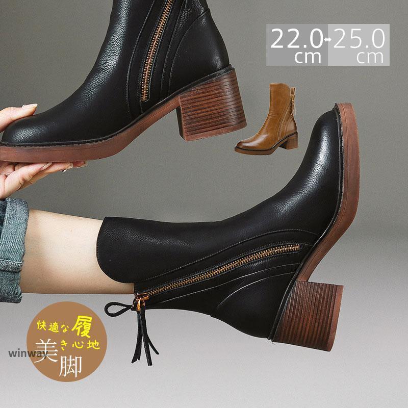 ブーツ スクエアトゥ フェイクレザー ショートブーツ 太ヒール 痛くない 歩きやすい 疲れない 秋 冬 ワイド 美脚ブーツ おしゃれ ジップアップ