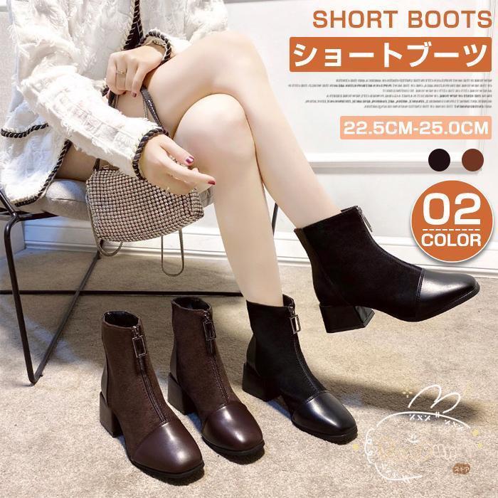 ショートブーツ レディース 厚底 太ヒール クラシック スクエアトゥ ブーツ フロントジップ ショート おしゃれ かわいい シューズ