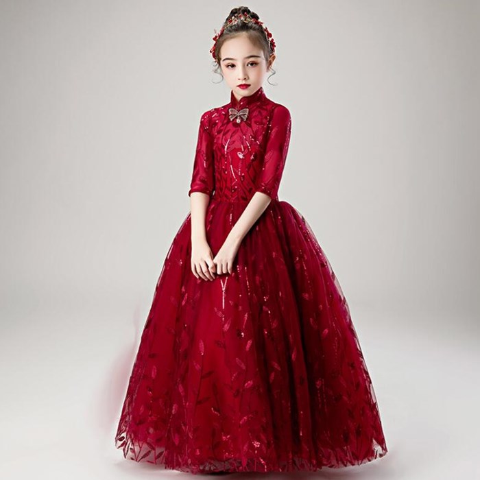 子供ドレス レッド こども 発表会 ドレス ミニ ロング 袖付き 袖あり プリンセスドレス ピアノ発表会 結婚式 演奏会 可愛い おしゃれ 150cm 160cm