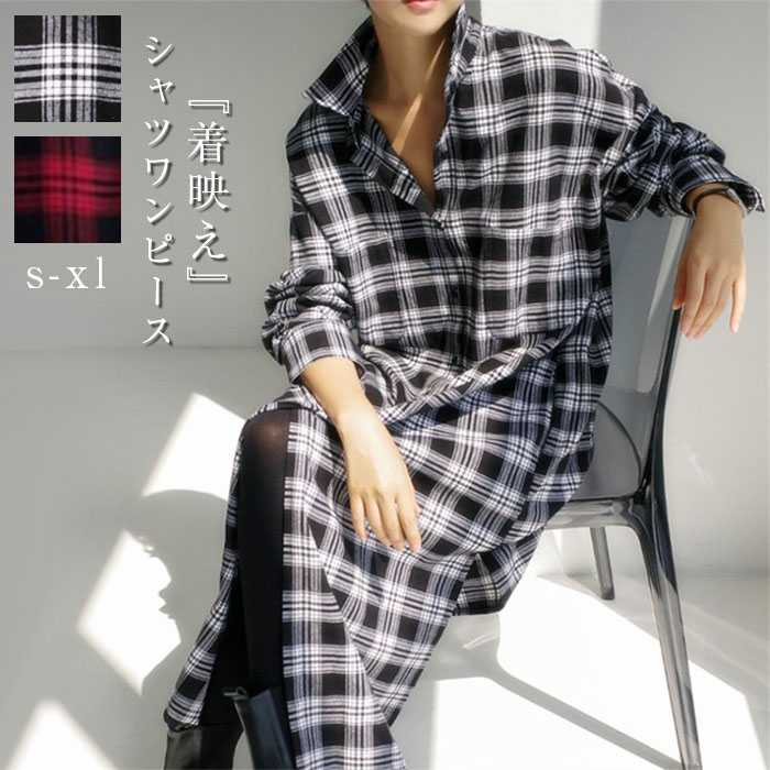 シャツワンピース ワンピース レディース 長袖 チェック柄 体型カバー ロング丈 大きいサイズ ゆったり 着痩せ 春 秋 シンプル お洒落 おしゃれ オシャレ ワンピース ゆるっと 重ね着