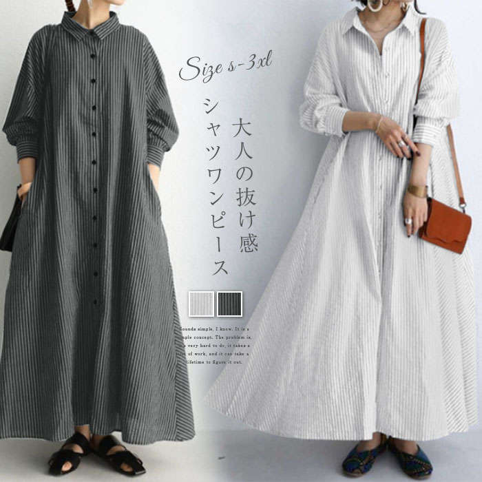 シャツワンピース 長袖 秋 春 大きいサイズ ロング丈 シャツ ワンピース レディース ストライプ柄 秋 夏 ワンピース 羽織り ロング丈シャツ レディース 体型カバー