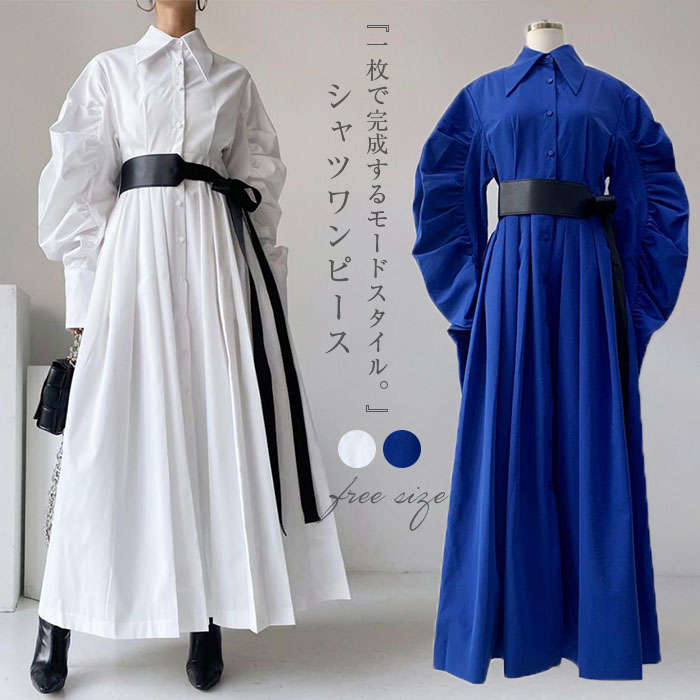 シャツワンピース レディース 長袖 春 秋 ボリューム袖 ロング丈 プリーツ 大きいサイズ マキシ丈 シャツ ワンピース プリーツ シャツワンピース 無地 ゆったり ビッグシルエット