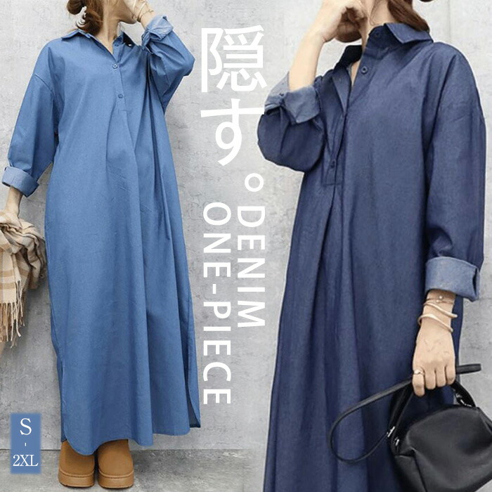 ワンピース 春 秋 マキシ丈 ワンピース シャツワンピース デニムライク シャツ ブラウス ワンピ シャツワンピ ロング チュニック ロング きれいめ シンプル カジュアル ゆったり