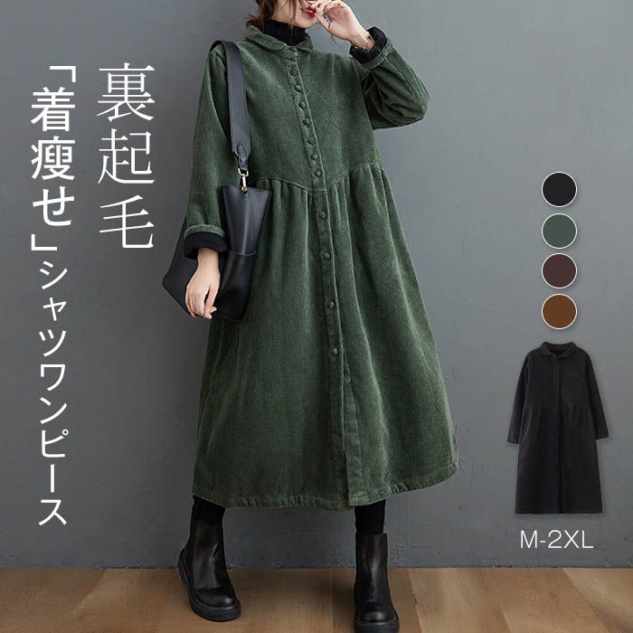 シャツワンピース 裏ボア レディース ロングコート コーデュロイワンピース 秋冬 裏起毛 ワンピース ロング 大きいサイズ ミモレ丈 前開き 長袖 ワンピ ゆったり 体型カバー 厚手 防寒