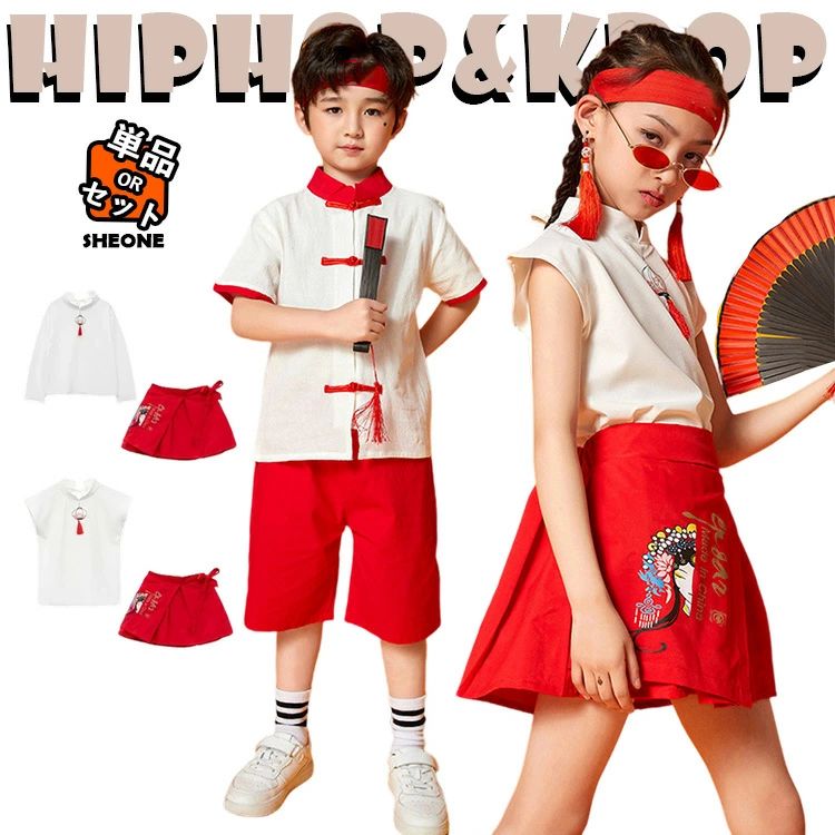 赤 白 中国風 唐装 京劇 キッズ ダンス衣装 セットアップ 男の子 女の子 チャイナ トップス スカート ショートパンツ ヒップホップ ジャズダンス ポッピング 写真撮影 中華服 漢服 子