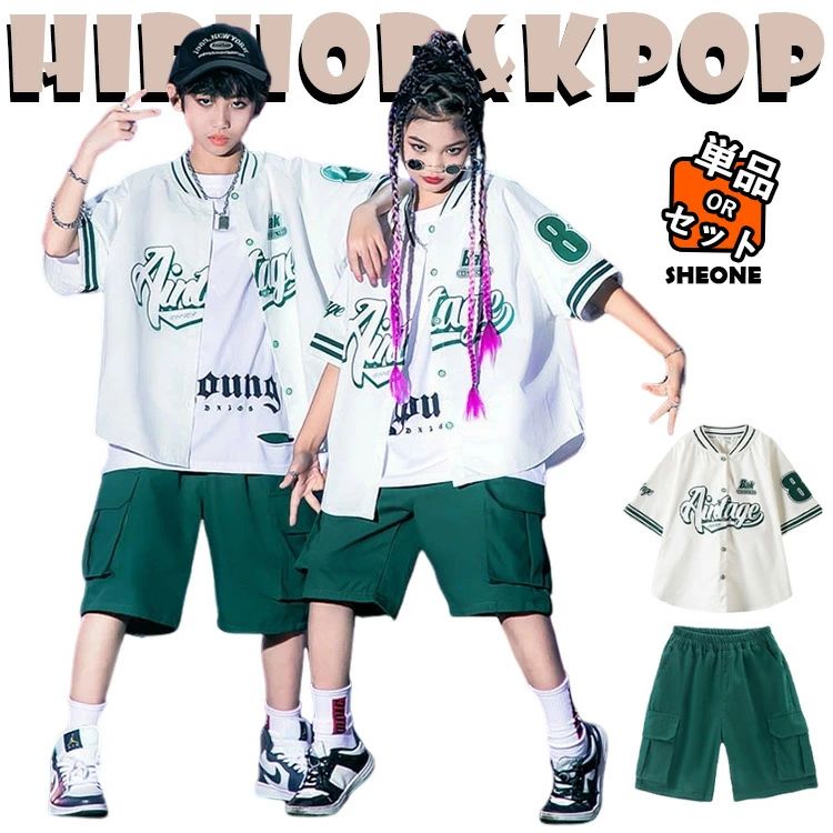 緑 ベースボールシャツ 夏 半袖 キッズ ダンス衣装 セットアップ 男の子 女の子 かっこいい おしゃれ ゆったり カジュアルシャツ トップス グリーン カーゴ短パン ジャズダンス ヒッ