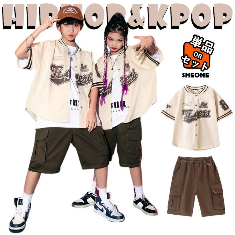 茶色 ベースボールシャツ 夏 半袖 キッズ ダンス衣装 セットアップ 男の子 女の子 かっこいい コーヒー おしゃれ ゆったり カジュアルシャツ トップス ブラウン カーゴ短パン ジャズ