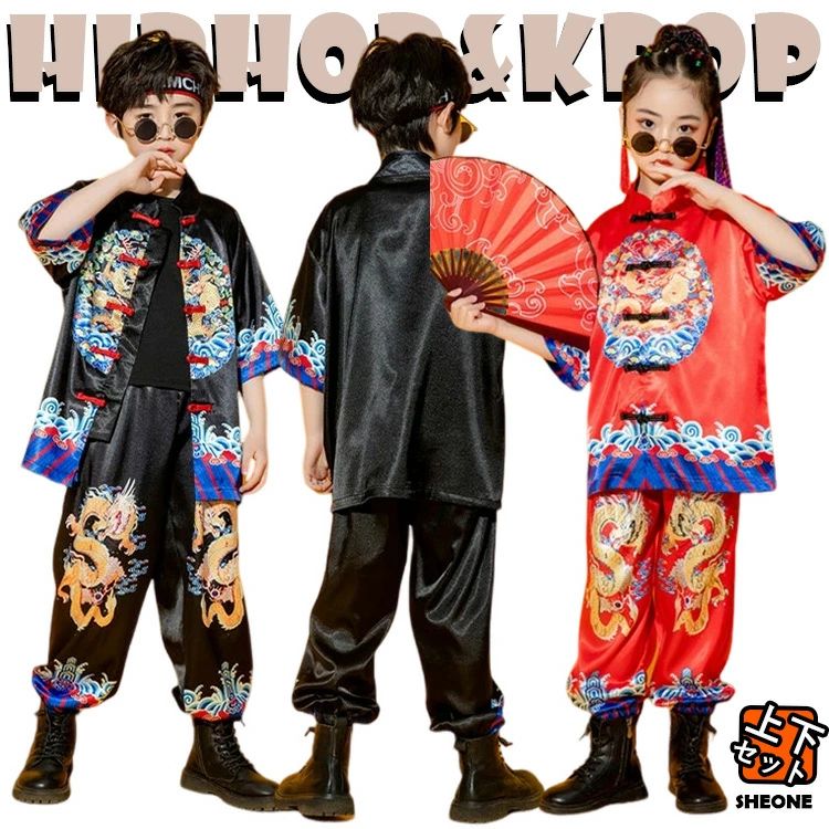 和風 赤 黒 浮世絵 竜柄 キッズ ダンス衣装 セットアップ 文化祭 発表会 女の子 男の子おしゃれ 派手 チャイナ風 上下セット チャイナボタン 演出 ステージ衣装 ジャズダンス トップ