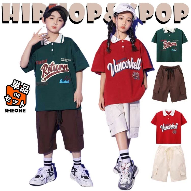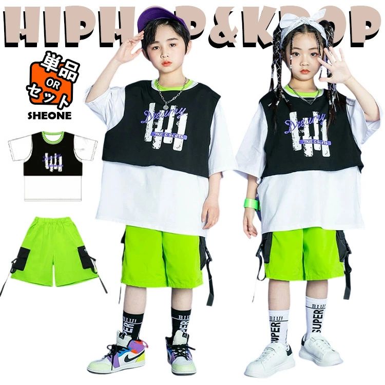 キッズ ダンス衣装 セットアップ 男の子 女の子 かっこいい 赤 ベスト 白 緑 半袖シャツ ゆったり カジュアルシャツ トップス 赤 緑短パン ジャズダンス ヒップホップ 韓国 k-pop 発